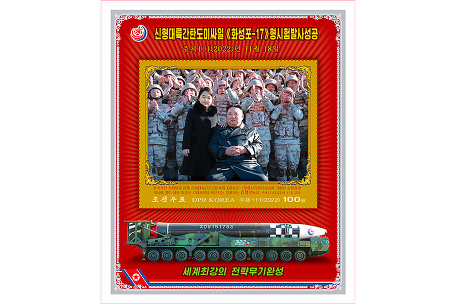 Почтовый блок назван «Успешный испытательный запуск новой межконтинентальной баллистической ракеты «Хвасон-17». В него вошли восемь марок, на большинстве из них лидер КНДР запечатлен вместе со своей дочерью.