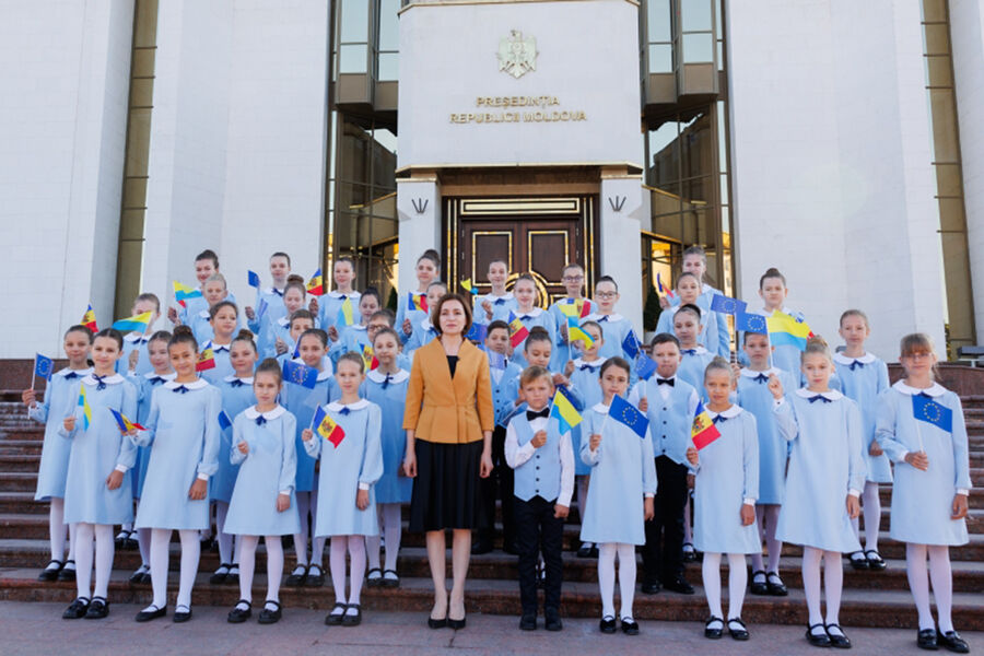 На фото глава Молдавии находится в окружении детей из хора, некоторые из них держат перевернутые флаги Украины, другие стоят с символами Молдавии и ЕС.