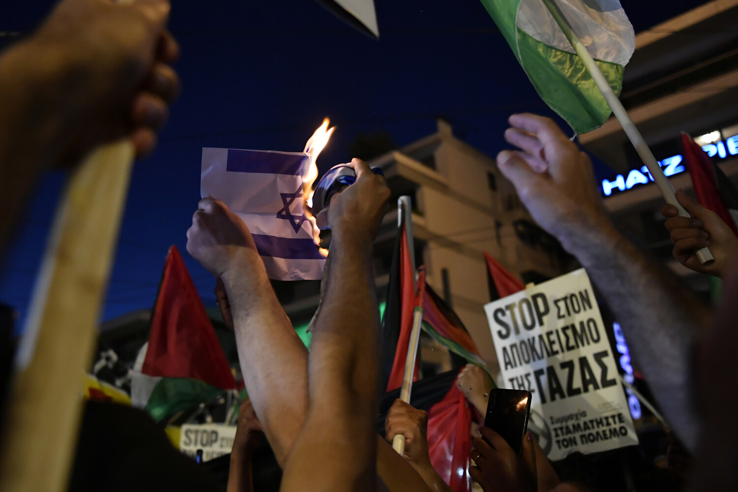На Потсдамской площади собралось около тысячи человек. Митингующие развернули флаги Палестины. Они выкрикивали антиизраильские лозунги и скандировали «Аллах акбар».