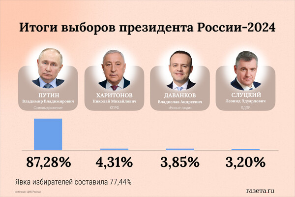 С 15 по 17 марта в России проходило голосование на выборах президента, в том числе в дистанционном формате. За президентский пост впервые с 2008 года боролись четыре кандидата: Владислав Даванков («Новые люди»), Владимир Путин (в качестве самовыдвиженца), Леонид Слуцкий (ЛДПР) и Николай Харитонов (КПРФ).