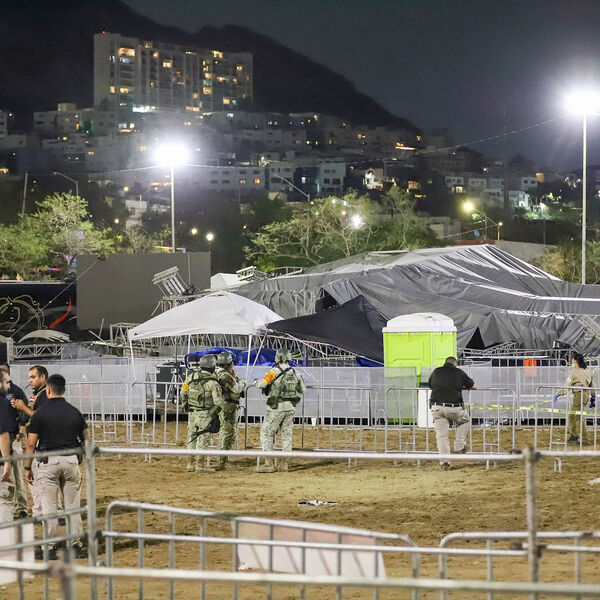 Причиной обрушения декораций стал сильный ветер. Информации о состоянии политиков пока нет.