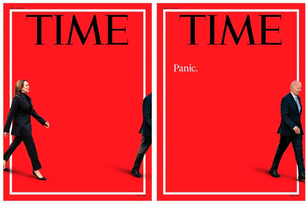 Журнал Time на своей обложке показал фотографию ноги уходящего из кадра президента США Джо Байдена и изображение вице-президента Камалы Харис, которая входит с левого края обложки и идет к ее центру.