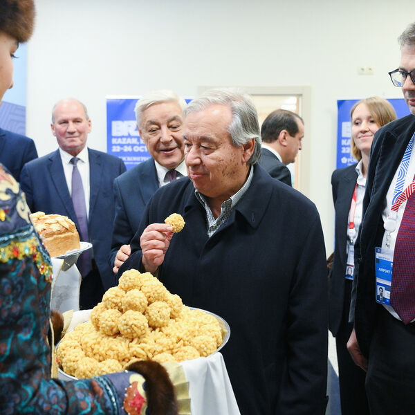 23 октября Гутерриш прибыл на саммит БРИКС. Генсека ООН в международном аэропорту Казань имени Тукая встретил председатель государственного совета Республики Татарстан Фарид Мухаметшин.