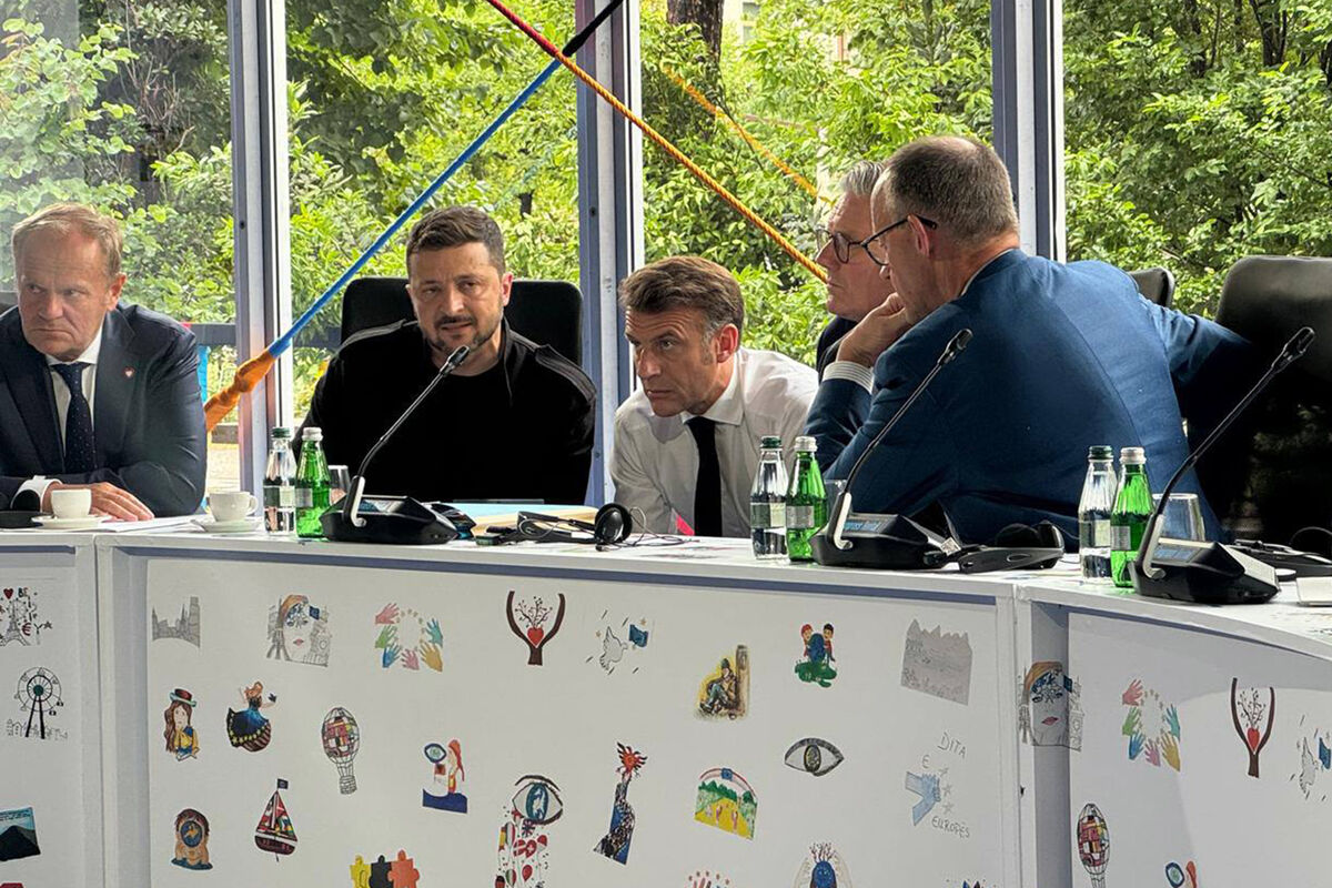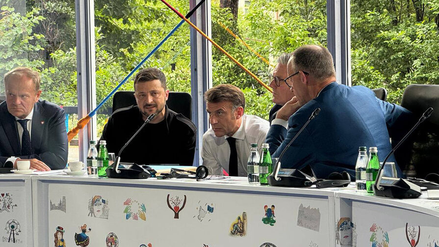 На кадре также видно премьер-министров Польши, Германии и Великобритании Дональда Туска, Фридриха Мерца и Кира Стармера и президента Франции Эммануэля Макрона.