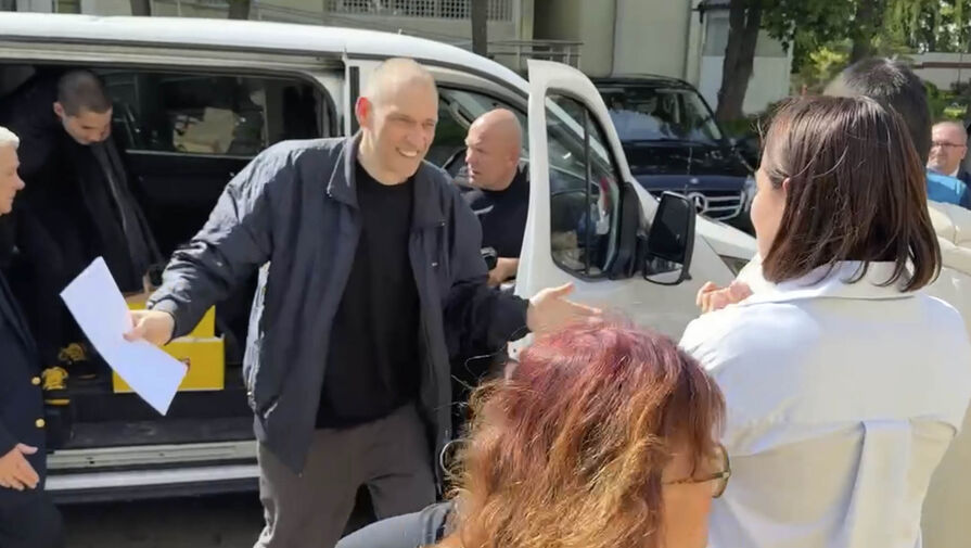 На видео мужчина выходит из белого микроавтобуса под аплодисменты. Его обнимает Светлана Тихановская.