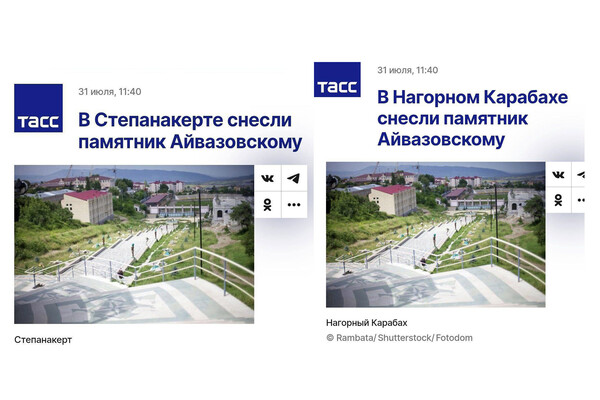 Российское госагентство ТАСС в заметке о сносе памятника художнику Ивану Айвазовскому изменило название места, где произошел инцидент. Теперь в публикации написано, что все случилось в Нагорном Карабахе, а не в Степанакерте.