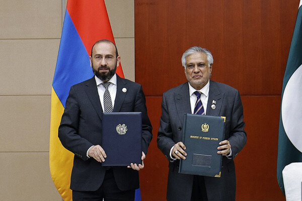 Министр иностранных дел Армении Арарат Мирзоян и его пакистанский коллега Исхак Дар провели встречу на полях саммита Шанхайской организации сотрудничества (ШОС) в Китае и заявили о решении установить дипломатические отношения. Об этом сообщает МИД республики в Telegram-канале.