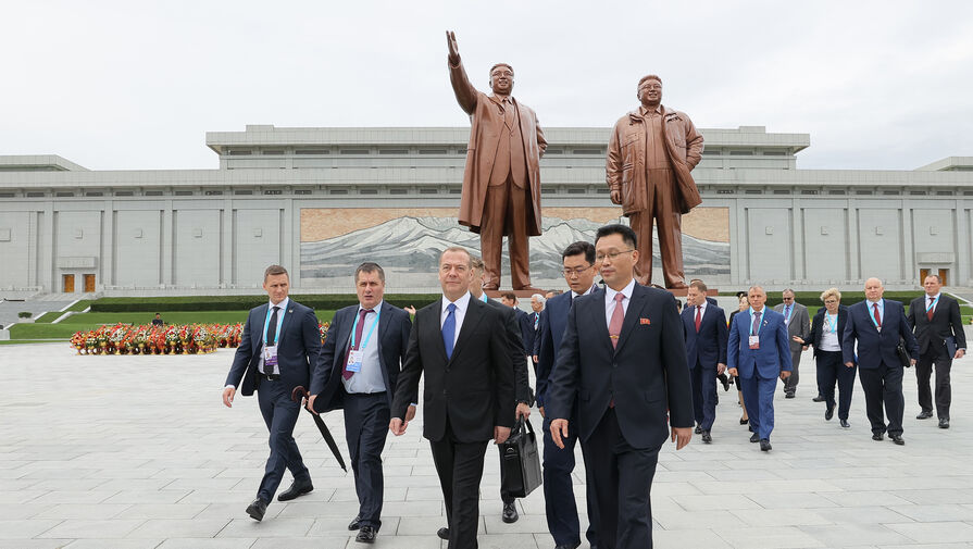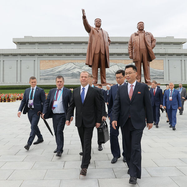 Председатель партии «Единая Россия», заместитель главы Совета безопасности РФ Дмитрий Медведев во время визита в Пхеньян возложил цветы к статуям Ким Ир Сена и Ким Чен Ира. Об этом сообщает РИА Новости.