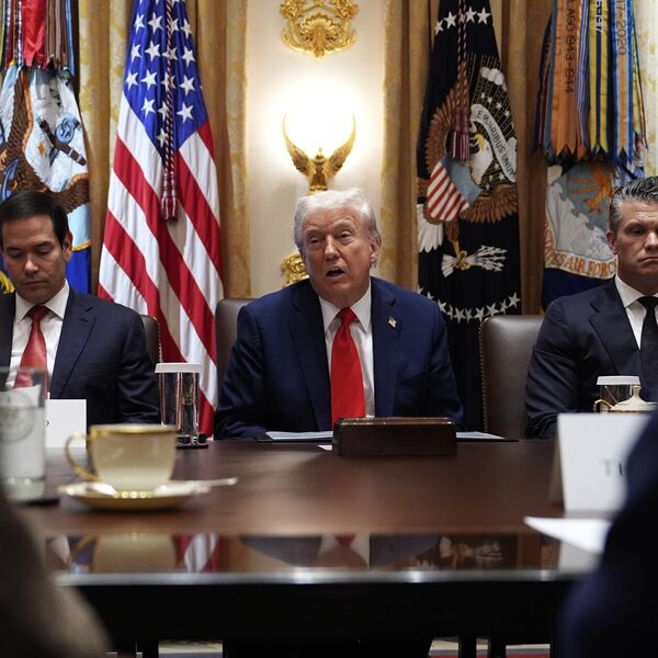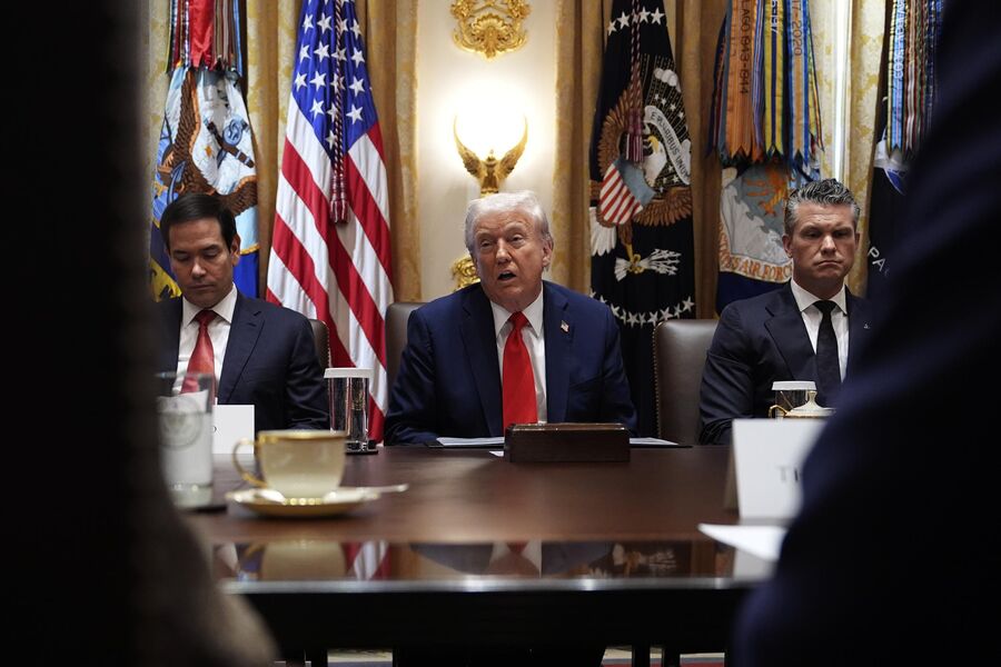 Фотография была сделана во время заседания Кабинета министров в четверг, и на ней изображен Трамп, сидящий перед зажженной лампой в виде золотого орла , что создает иллюзию наличия рогов на голове.