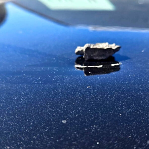 На фотографии видно, что в результате падения осколка на патрульном автомобиле осталась небольшая вмятина и царапина.