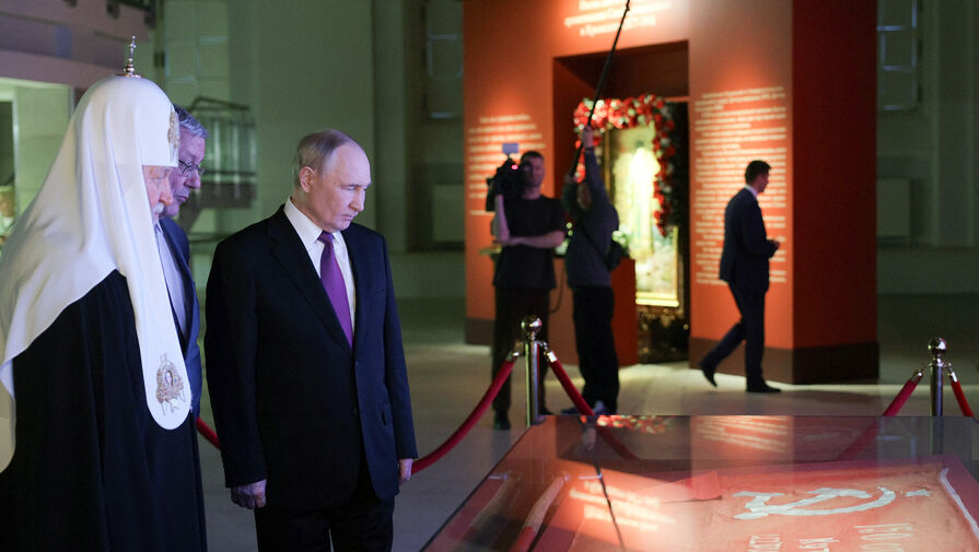 После российский лидер перешел к осмотру экспозиции, которая открывается со Знамени Победы.