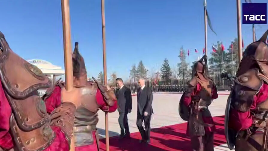 На видео, опубликованном в сети, можно увидеть, что для встречи Путина и президента Киргизии Садыра Жапарова у Дворца единства выстелили красную ковровую дорожку. Вдоль нее выстроился почетный караул, а также киргизские воины, облаченные в костюмы богатырей.