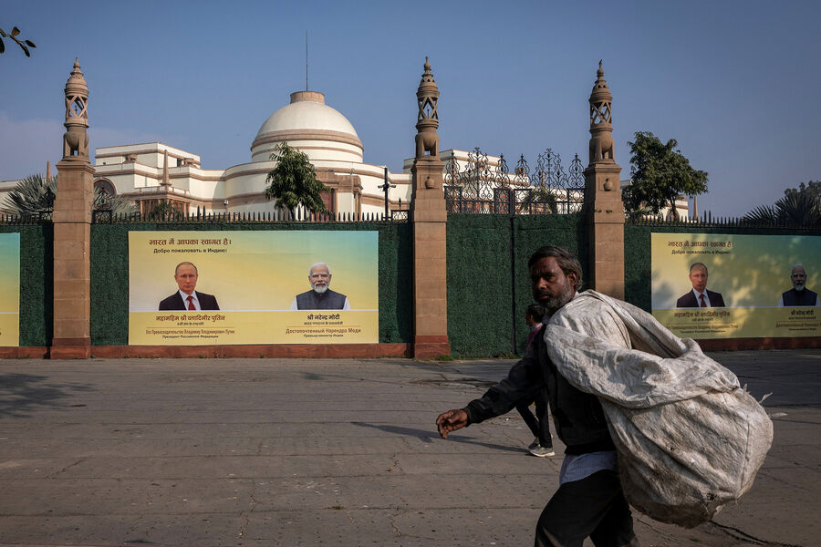 Нью-Дели тщательно готовится к визиту российского лидера. Город украсили флагами РФ и Индии, ранним утром по главным улицам Нью-Дели проехали поливальные машины.