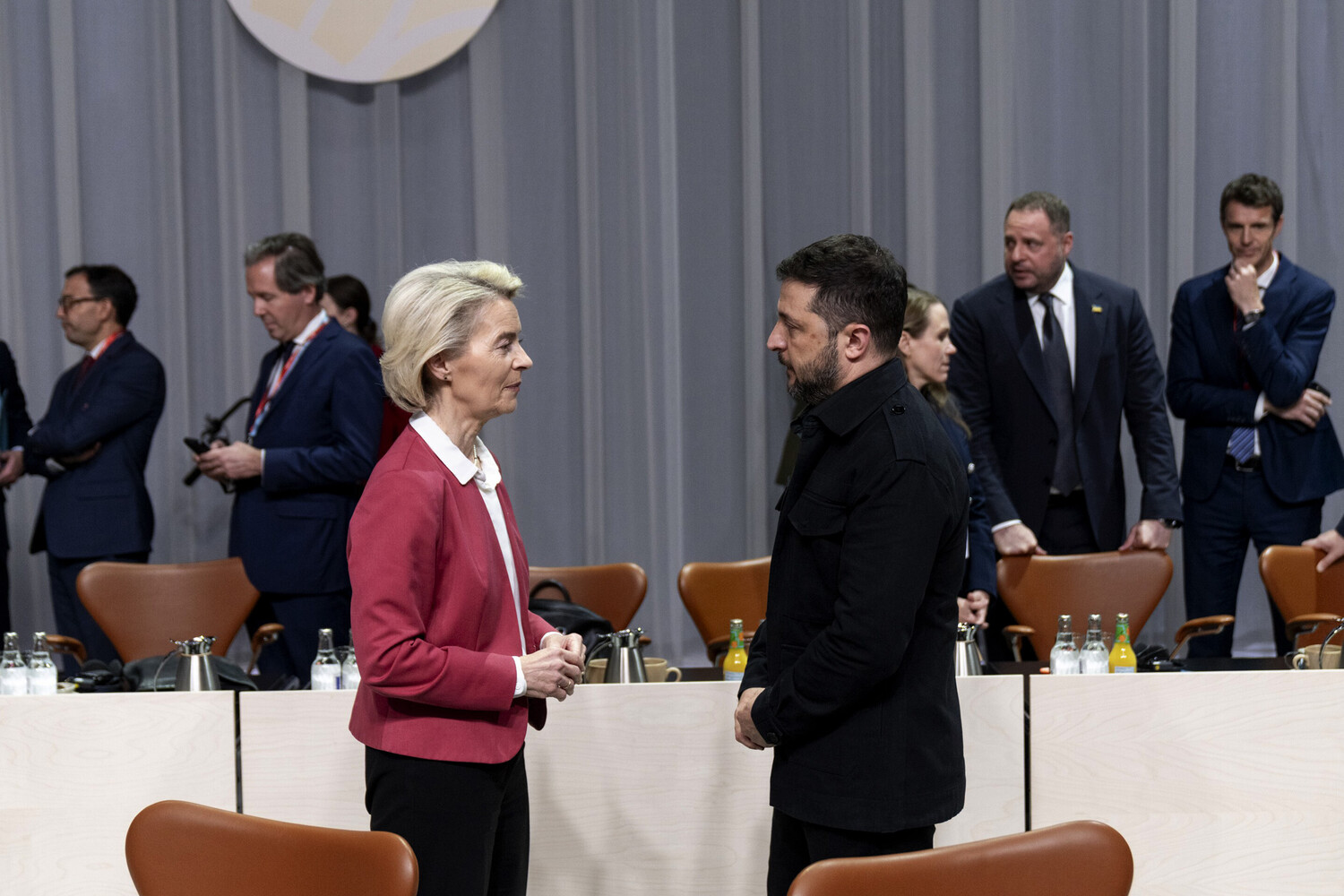 Авторы публикации пишут, что фон дер Ляйен «состроила Зеленскому укоризненную гримасу» и в шутку пригрозила пальцем. Сцена выглядела так, будто Зеленский тайно пытался вписать в итоговое коммюнике фразу о нападении на Россию, надеясь, что ее никто не заметит.