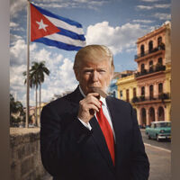 Глава Белого дома репостнул изображение, на котором он предстает в черном костюме и красном галстуке с сигарой на фоне кубинского флага. На картинке также присутствует надпись: «Лучшие в мире кубинские сигары».
