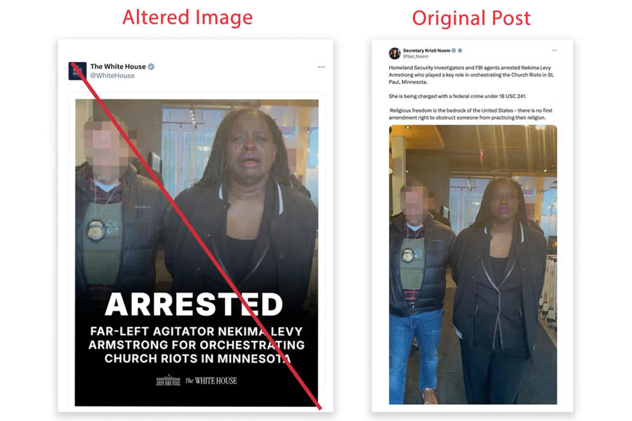 Кадр с активисткой, которую задержали за срыв церковной службы в Миннесоте, бы опубликован в соцсети Х Белого дома. В тот же день на странице министра внутренней безопасности США Кристи Ноэм в X появилась оригинальная фотография. На ней Армстронг спокойно смотрит вперед, в свою очередь на снимке Белого дома она рыдает. Также к фото была добавлена надпись: «Арестована крайне левый агитатор Некима Леви Армстронг за организацию беспорядков в церкви в Миннесоте».