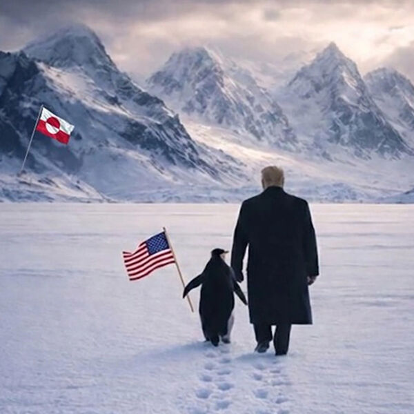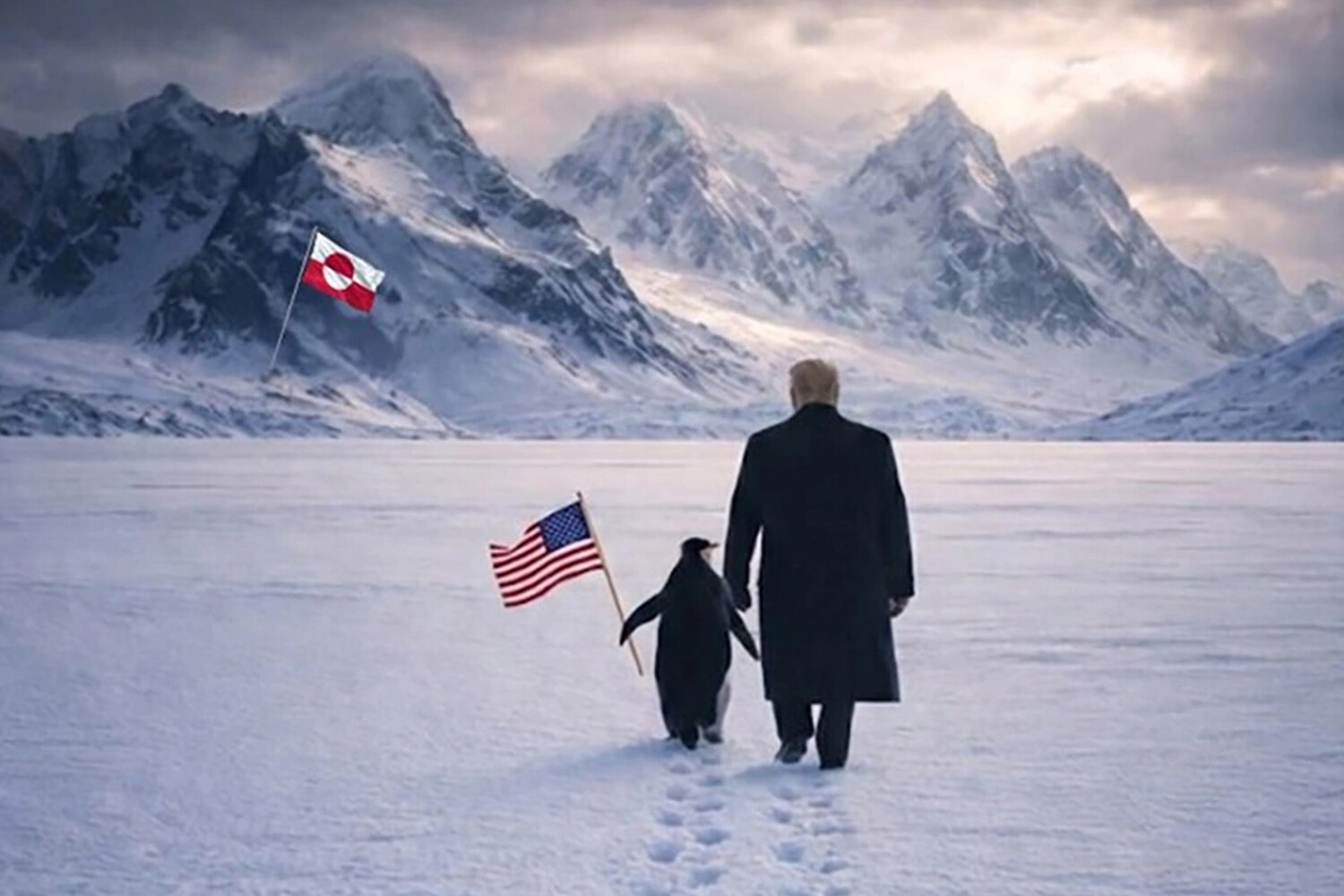 Белый дом опубликовал в соцсети X изображение президента США Дональда Трампа, идущего по снегу Гренландии с пингвином, который несет американский флаг.