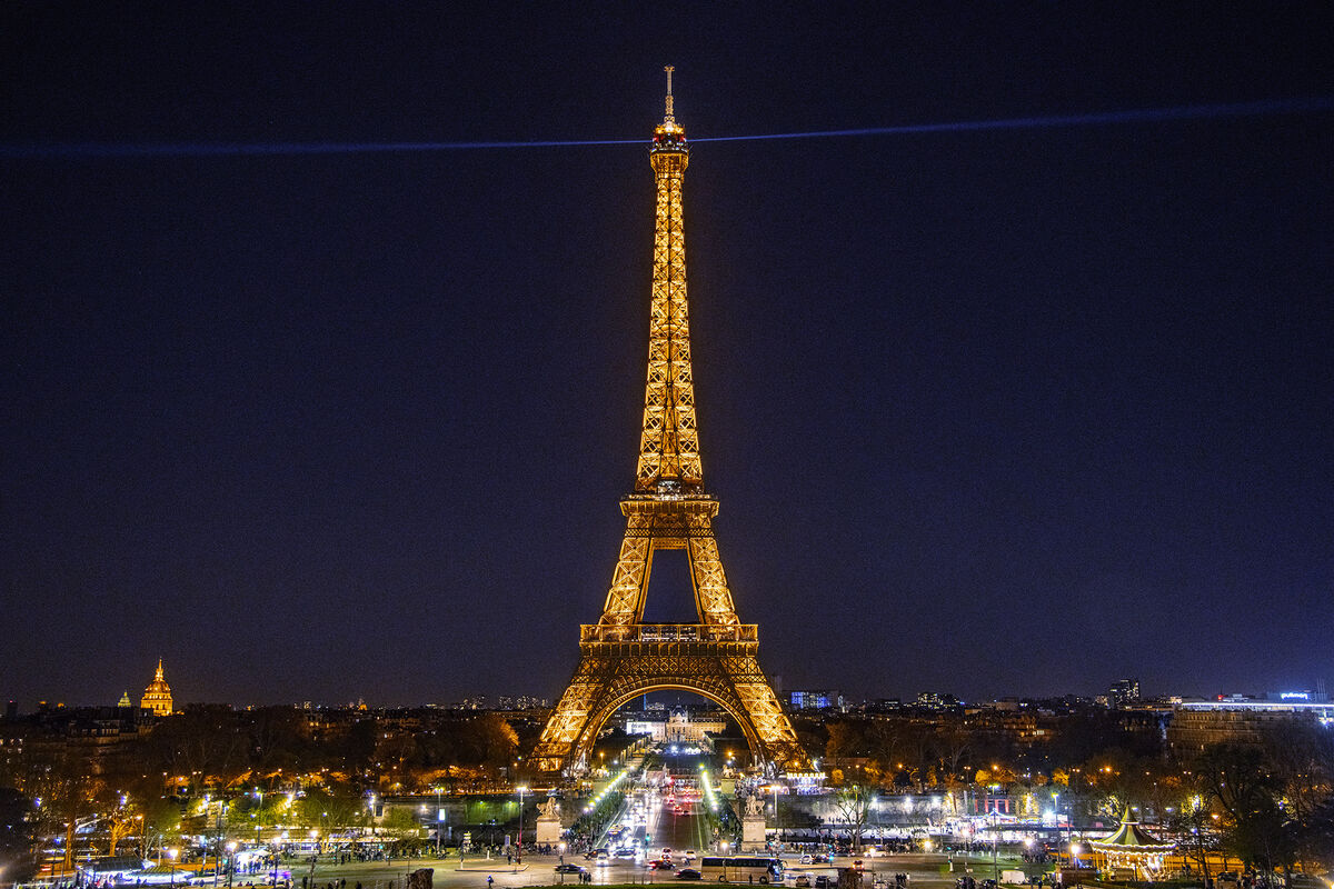 На кадрах с места событий видно, что архитектурная достопримечательность Парижа вечером 24 февраля была подсвечена желтым и синим цветами.