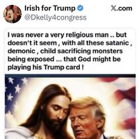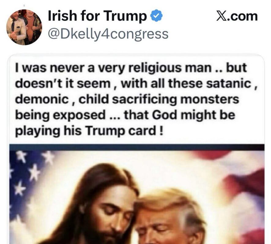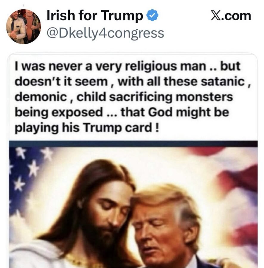 На изображении показано, как Трамп с закрытыми глазами соприкасается виском с Иисусом. При этом американский лидер стоит за микрофоном, а позади него развевается американский флаг. В оригинальном посте была подпись: «Бог, вероятно, разыгрывает свою козырную карту!» (в оригинале присутствует игра слов: Trump card — козырная карта, также звучит по-английски и фамилия американского президента — прим. ред). В своем репосте под картинкой президент США добавил следующее: «Леворадикальным психам это, скорее всего, не понравится, но мне кажется это милым !!!»