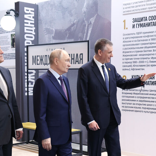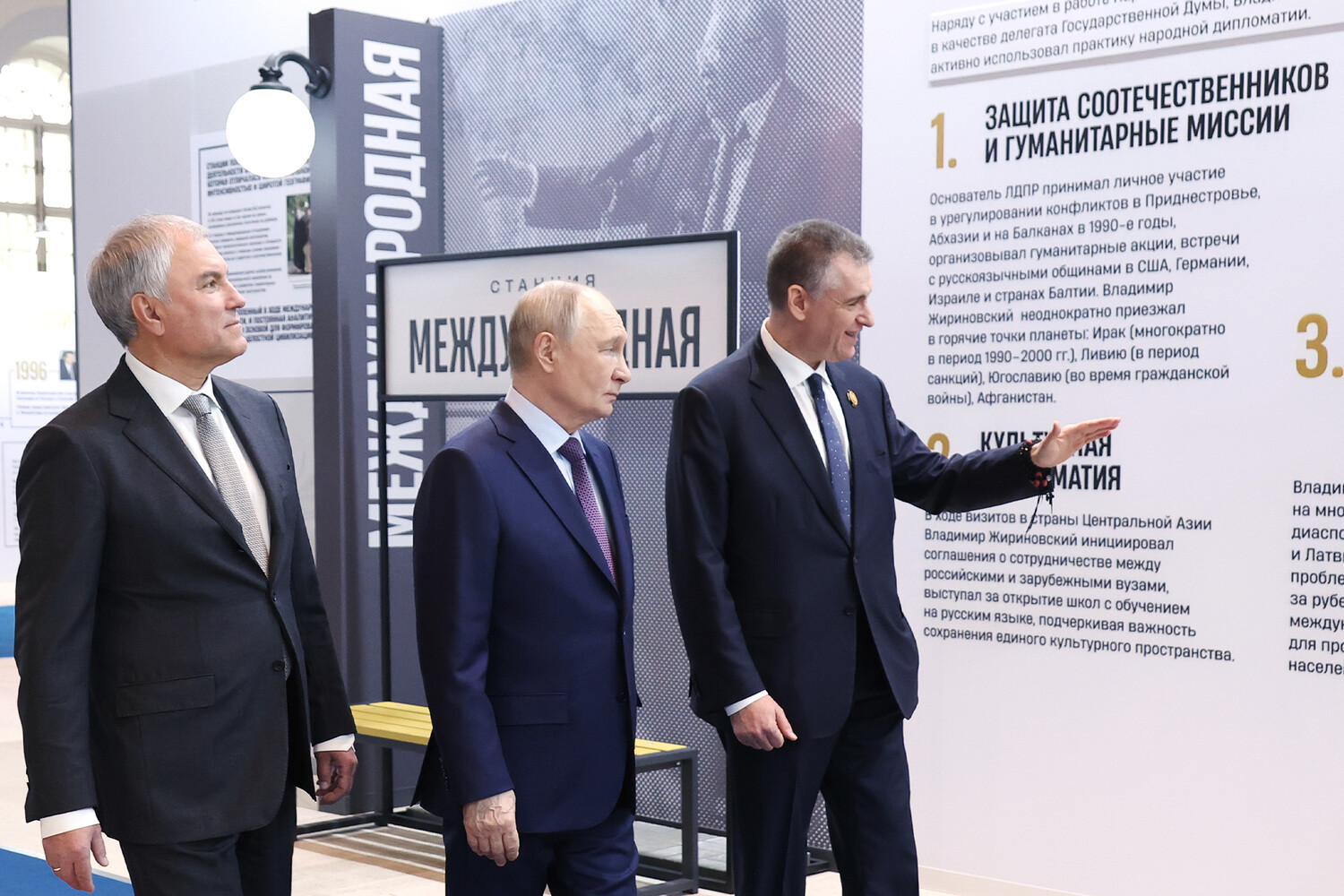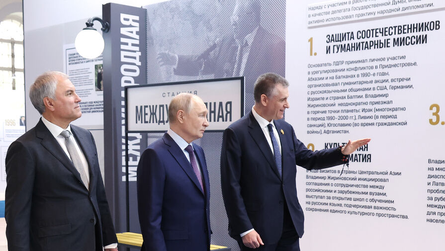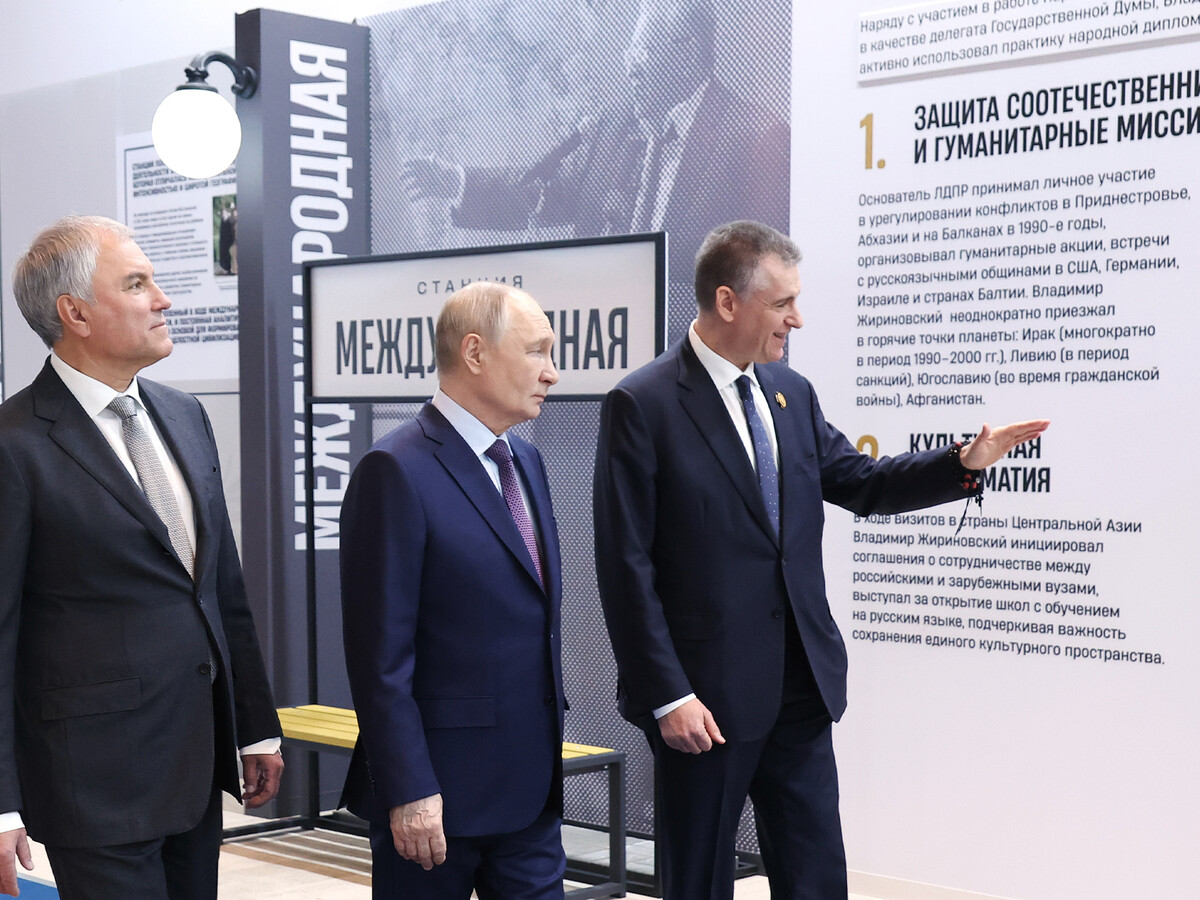 Во время осмотра экспозиции, посвященной 80-летию со дня рождения политика, лидер ЛДПР Леонид Слуцкий рассказал главе государства историю накидки.