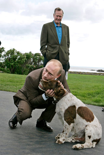 Владимир Путин с лабрадором Кони, 2003 год Владимир Путин и губернатор Самарской области Константин Титов во время визита в деревню Кузькино, 2000 год Владимир Путин с щенком, рожденным его любимой собакой лабрадором Кони. 2004 год Владимир Путин в деревне Верхние Мондроги Подпорожского района во время встречи с местными жителями, 2001 год 2012 год Владимир Путин в подмосковной резиденции Ново-Огарево со своей собакой Баффи, 2010 год. Владимир Путин в гостях у премьер-министра Венгрии Ференца Дюрчаня и его супруги, 2006 год Владимир Путин и канцлер Германии Ангела Меркель во время встречи в резиденции «Бочаров Ручей». На снимке в центре - лабрадор Кони, 2007 год Владимир Путин и бывший президент США Джордж Буш-старший во время встречи в семейном поместье Бушей в штате Мэн, 2007 год Владимир Путин на озере Тере-Холь, 2007 год Владимир Путин в расположении 121-го полка оперативного назначения Внутренних войск МВД, дислоцированного в Нальчике, 2008 год Владимир Путин и Дмитрий Медведев в резиденции «Бочаров ручей», 2009 год Владимир Путин держит на руках щенка болгарской овчарки, подаренного ему председателем Совета министров Болгарии Бойко Борисовым, 2010 год Владимир Путин и премьер-министр Японии Синдзо Абэ во время встречи в резиденции «Бочаров ручей», 2014 год Владимир Путин во время прогулки со своими собаками болгарской овчаркой Баффи и акита-ину Юмэ, 2013 год Владимир Путин с собакой по кличке Юмэ породы акита-ину, подаренной в 2012 году губернатором префектуры Акита Норихисом Сатакэ, 2016 год Художник-кондитер Никита Гусев с шоколадной фигурой Владимира Путина, которую он изготовил для фестиваля «Праздник шоколада», 2015 год