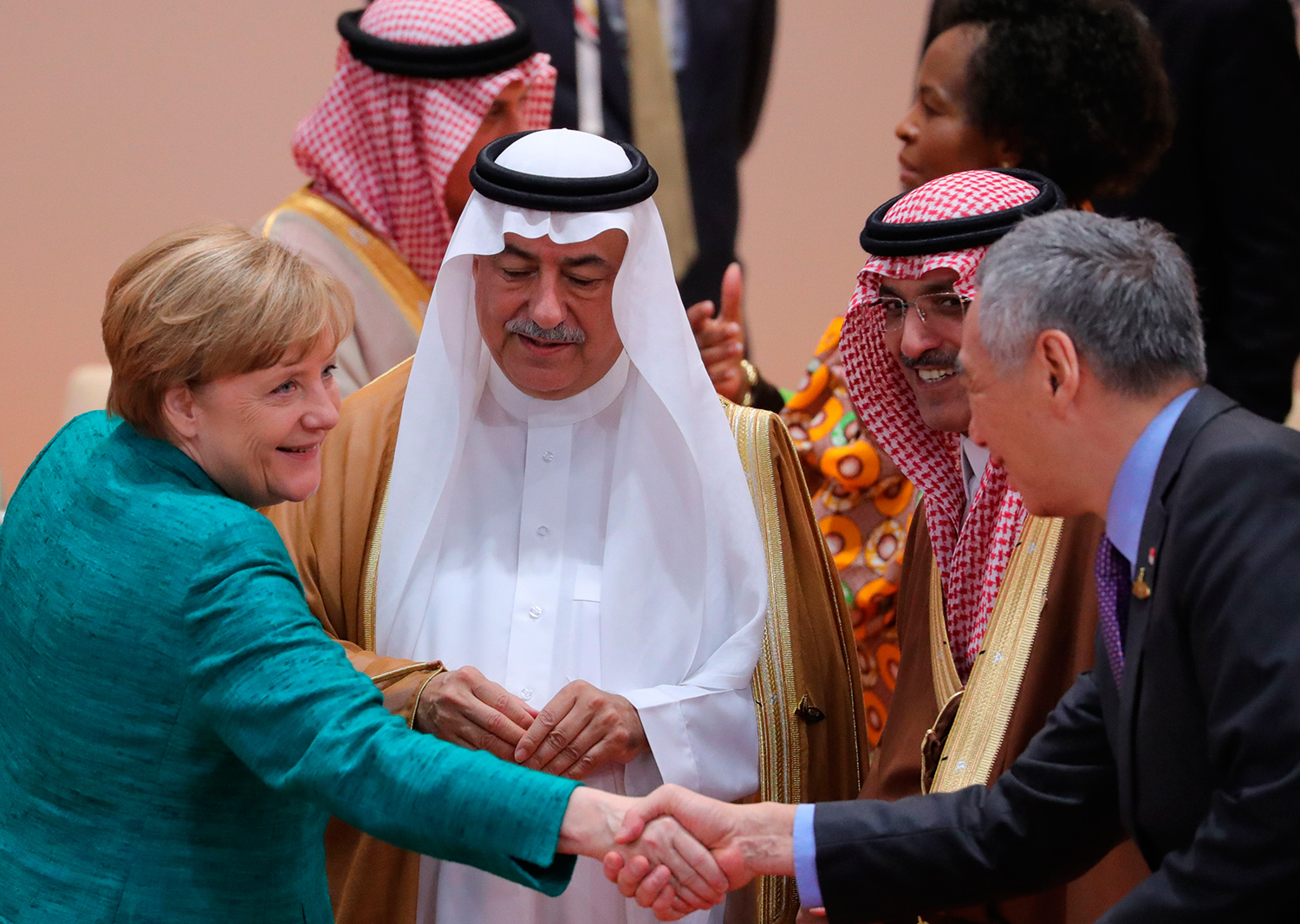 Канцлер Германии Ангела Меркель и государственный министр Саудовской Аравии Ибрагим Абдулазиз аль-Ассаф перед началом третьего заседания глав делегаций государств –