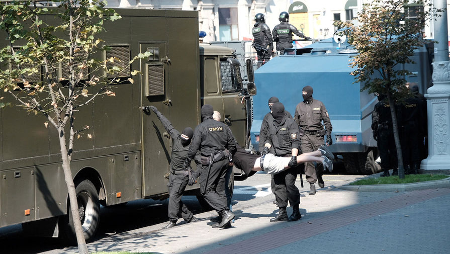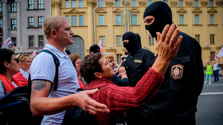 Участники «Марша мира и независимости» в Минске, 30 августа 2020 года Силовики во время акции протеста в Минске, 30 августа 2020 года