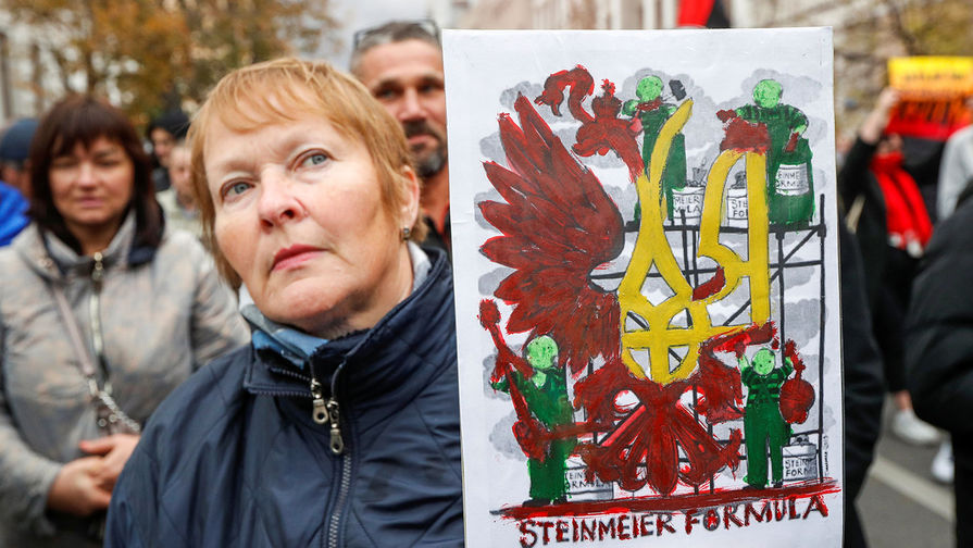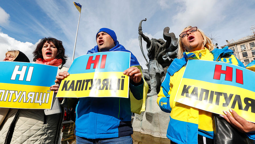 В Киеве около 10 тысяч участников митинга против подписания «формулы Штайнмайера» по Донбассу пришли к офису президента Владимира Зеленского. Демонстранты потребовали, чтобы президент «не переступил красные линии» во время урегулирования конфликта. Организатором акции протеста — «майдана желтых повязок» — выступают сторонники экс-президента Украины Петра Порошенко, они назвали вече «предупредительным».