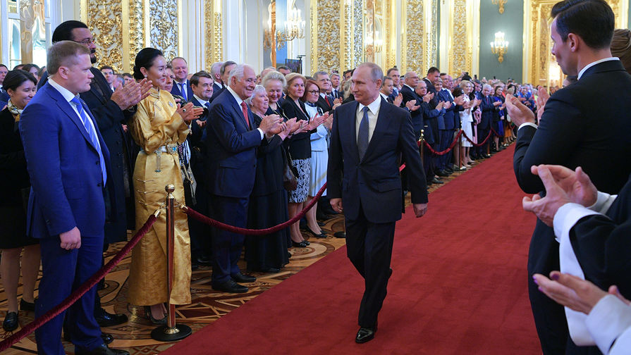 Президент России Владимир Путин во время парада Президентского полка на Соборной площади в Кремле после церемонии инаугурации, 7 мая 2018 года Художественный руководитель Московского Губернского драматического театра Сергей Безруков перед началом церемонии инаугурации президента России Владимира Путина в Кремле, 7 мая 2018 года Парад Президентского полка на Соборной площади в Кремле после церемонии инаугурации Владимира Путина на пост президента России, 7 мая 2018 года Президент России Владимир Путин после церемонии инаугурации в Кремле, 7 мая 2018 года Гости перед началом церемонии инаугурации президента России Владимира Путина в Кремле, 7 мая 2018 года Модельер Валентин Юдашкин перед началом церемонии инаугурации президента России Владимира Путина в Кремле, 7 мая 2018 года Генеральный секретарь Олимпийского комитета России (ОКР) Анастасия Давыдова, олимпийская чемпионка по синхронному плаванию, телеведущая Мария Киселева и трехкратная олимпийская чемпионка Ольга Брусникина во время церемонии инаугурации президента России Владимира Путина в Кремле, 7 мая 2018 года Президент Единой лиги ВТБ Сергей Кущенко, президент Федерации лыжных гонок России Елена Вяльбе и президент Союза ММА России Федор Емельяненко перед началом церемонии инаугурации президента России Владимира Путина в Кремле, 7 мая 2018 года Гости перед началом церемонии инаугурации президента России Владимира Путина в Кремле, 7 мая 2018 года Президент России Владимир Путин перед началом церемонии инаугурации в Кремле, 7 мая 2018 года