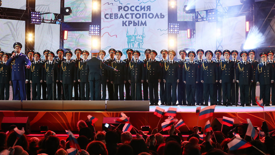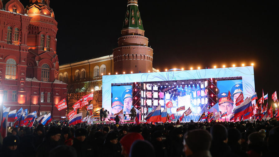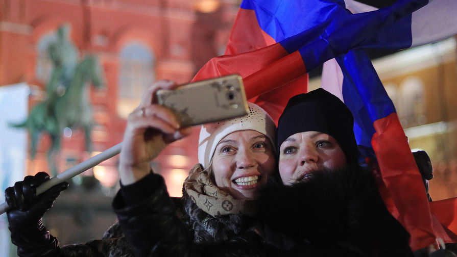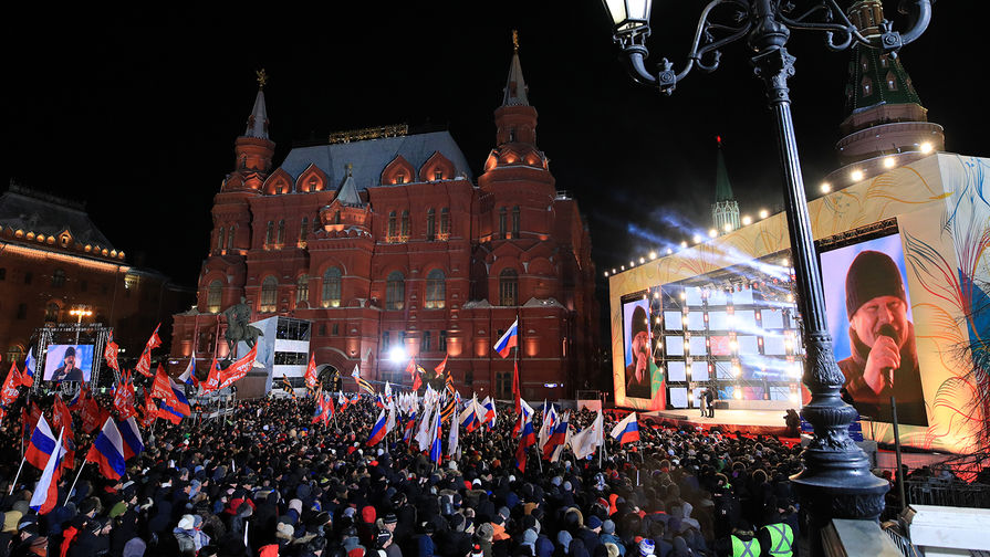 Вечером 18 марта на Манежной площади в Москве начался концерт, посвященный четырехлетней годовщины «возвращения Крыма в родную гавань». Название мероприятия - «Россия. Севастополь. Крым». Этот праздник совпал с президентскими выборами и фактчески стал торжественной точкой после окончания голосования. На нем выступил и Владимир Путин. Он поблагодарил сторонников за результат. «Россия! Россия!» - скандировали зрители. «Газета» наблюдала за ходом праздника.
