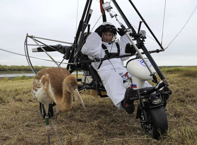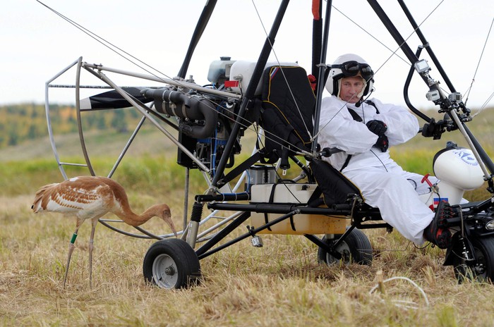 Владимир Путин совершил полет на мотодельтаплане вместе со стаей маленьких журавлей, занесенных в Красную книгу. По пути на саммит АТЭС во Владивосток президент России прилетел в Салехард, откуда на вертолете добрался до орнитологической станции «Кушеват». Там он пообщался с членами научно-исследовательской экспедиции «Полет надежды» и поучаствовал в одном из экспериментов, цель которого – показать выращенным в питомнике стерхам маршрут перелета. Находясь за штурвалом мотодельтаплана, который птицы принимают за своего вожака, Путин совершил три полета: первый — ознакомительный, а два других — с птицами.