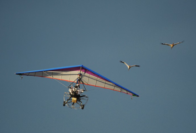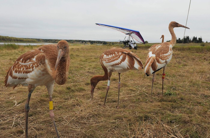 Орнитологи выдали президенту для полета на дельтаплане со стаей белый костюм и шлем. Чтобы птенцы приняли главу государства за вожака стаи, Путину обещали выдать еще и клюв, но позже директор Окского государственного природного биосферного заповедника Юрий Маркин заявил, что клюв не понадобится, птицы и так примут Путина за своего. Директор расположенного Окского государственного природного биосферного заповедника Юрий Маркин заверил, что журавлей специально не готовили к полету с президентом. Хотя на сайте Окского заповедника еще в июне сообщалось, что 10 птенцов стерхов готовят для «Полёта надежды». А за месяц до того питомник посетил министр природных ресурсов и экологии Юрий Трутнев. В воздух вместе с журавлями Путин поднялся с орнитологической станции «Куршеват», куда прибыл на вертолете из Салехарда по пути на саммит АТЭС во Владивосток, сообщает пресс-служба Кремля. Президент перед полетом встретился с учёными-орнитологами во время пребывания на Ямале. В пресс-службе не уточняют личность человека, с которым Путин совершал полет. Журавли, взращенные в неволе, «не справились», а точнее не поспели за дельтапланом из-за сильно ветра и слишком высокой скорости, которую развил глава государства, сообщает «Российская газета» со ссылкой на заявление Путина. Перед основным заходом с птицами Путин совершил один тренировочный полет без стерхов. Еще несколько лет назад в мире насчитывалось 20 стерхов, занесенных в Красную книгу. В последнее время их популяция растет. Орнитологи рассчитывают, что за пять лет им удастся увеличить популяцию в 2-2,5 раза. Первый подобный эксперимент по обучению навыкам полета птенцов стерхов орнитологи предприняли еще в 2006 году, с тех пор они ежегодно выпускают птенцов на волю.