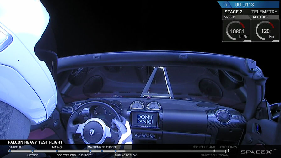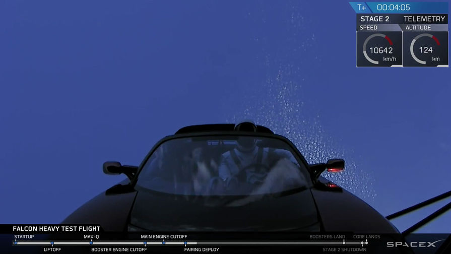 Вторая ступень выводит автомобиль на опорную орбиту, все три первые ступени начали свой спуск. «Охренеть» — не выдержал эмоций соведущий российской трансляции запуска. В машине заиграл Дэвид Боуи. Можно ди было все это представить еще десять лет назад?