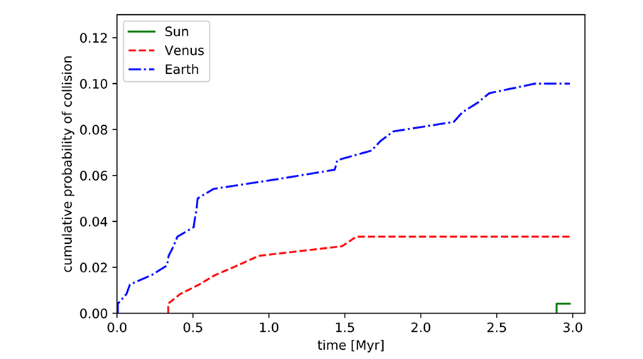 Напротив, оказалось, что как в краткосрочной, так и в долгосрочной перспективе доминирующее влияние на орбиту будут оказывать именно близкие пролеты мимо Земли. А с течением времени все большее влияние будет оказывать Венера.