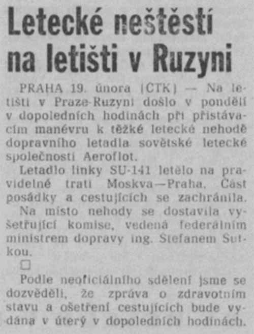 Это была первая катастрофа Ту-154. На следующий день в официальной газете компартии Чехословакии «Руде право» было опубликовано короткое сообщение с заголовком «Воздушная трагедия в Рузине», в которой сообщалось, что для расследования катастрофы создана комиссия во главе с министром транспорта Штефаном Шуткой. На период расследования полеты всех Ту-154 были временно прекращены.
