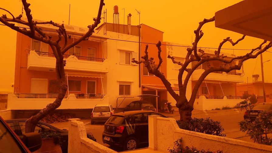 Накануне греческий остров Крит накрыла африканская пыль, в результате чего небо над ним окрасилось в оранжево-красный цвет. При этом видимость не превышала несколько сот метров, а местные жители страдали из-за проблем с дыханием.