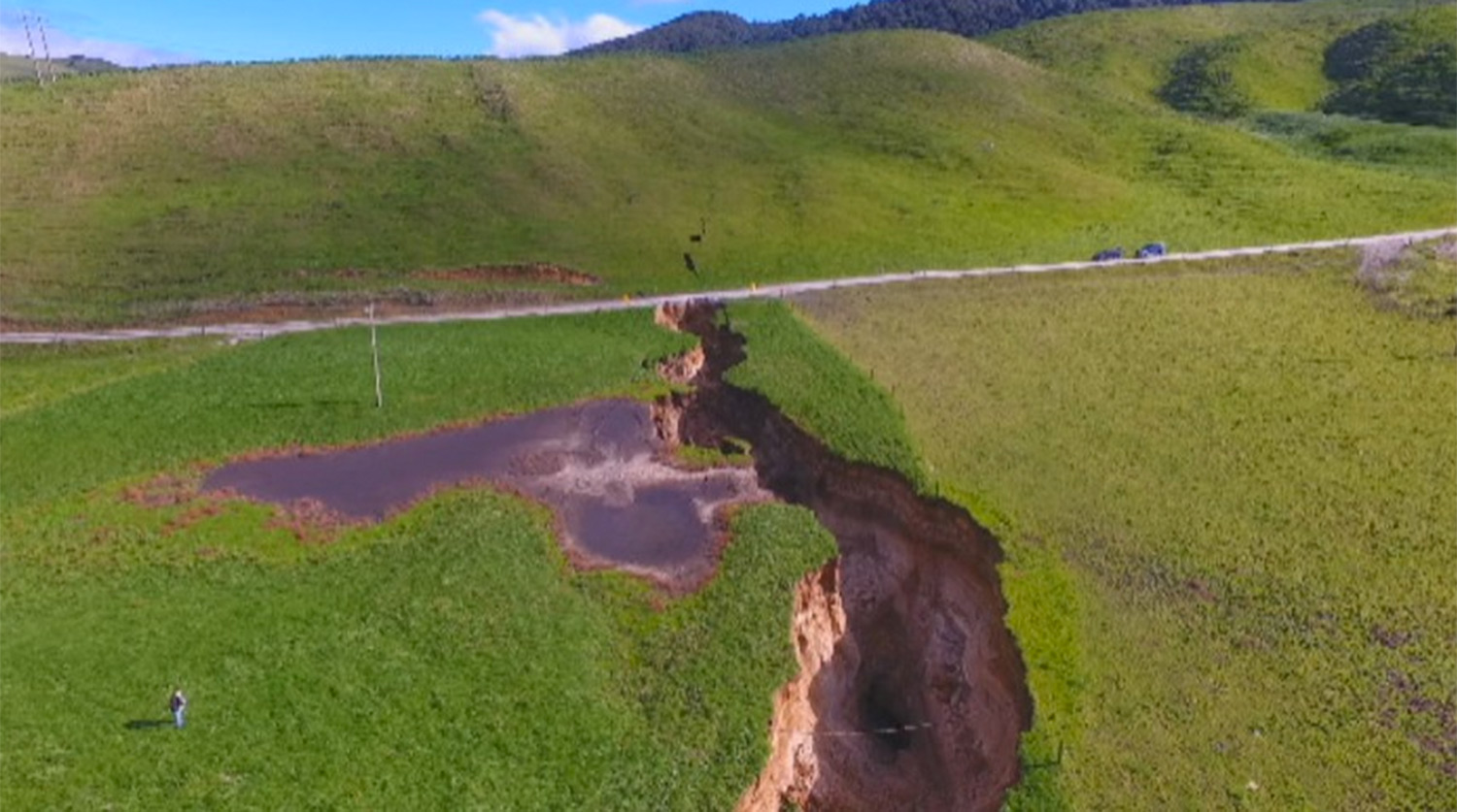 RAW VIDEO: See the massive sinkhole — six stories deep, two football fields long — that opened underneath a New Zealand farm. A volcanologist says it may have been growing underground for up to 100 years before recent heavy rain opened it up. https://t.co/LmtY2V4c7e pic.twitter.com/rxMXV2uEN4
