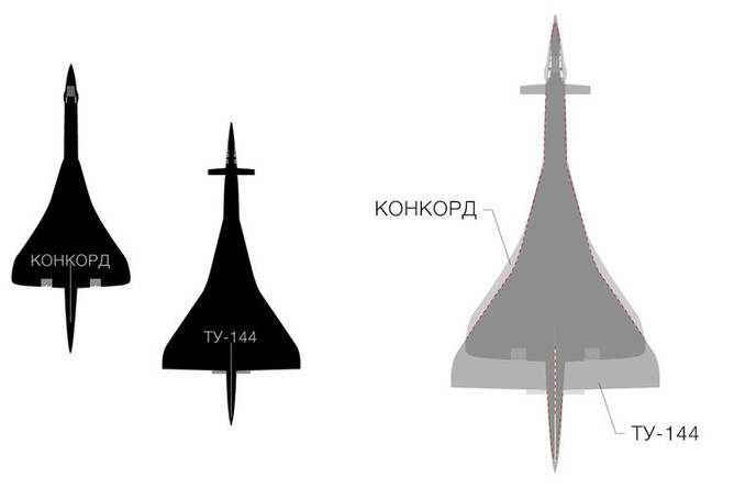 Оба самолета сильно опережали свое время, и их близкое внешнее сходство порождало на Западе немало разговоров о том, что русские срисовали свой самолет у европейцев. Характерной особенностью Ту-144 стала опускающаяся перед пилотской кабиной носовая часть фюзеляжа, которая обеспечивала обзор на больших углах атаки при взлете и посадке.