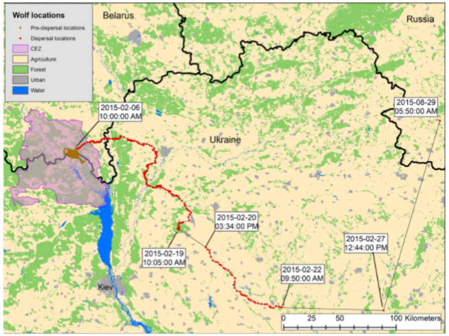 Ученым впервые удалось отследить волка, покинувшего Чернобыльскую зону отчуждения, и по всей видимости, проникшего в Россию. Это доказывает, что волки в зоне чувствуют себя прекрасно и могут пополнять соседние популяции.