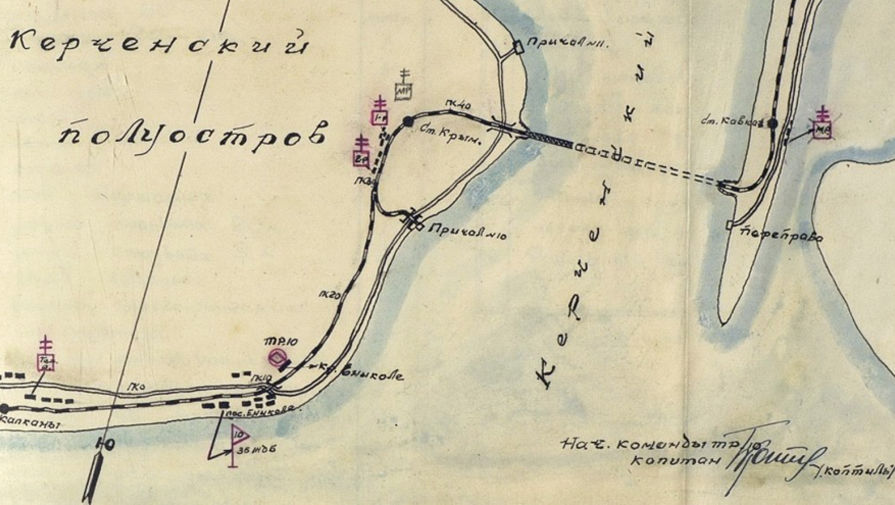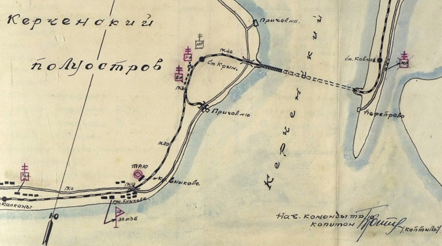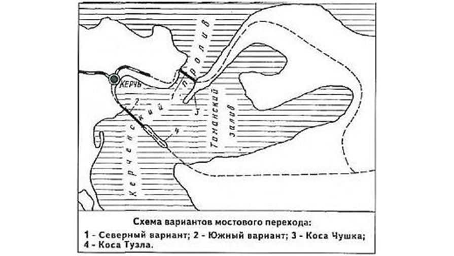 Трассу мостового перехода немцы наметили севернее Керчи, от косы Чушка к поселку Опасное.