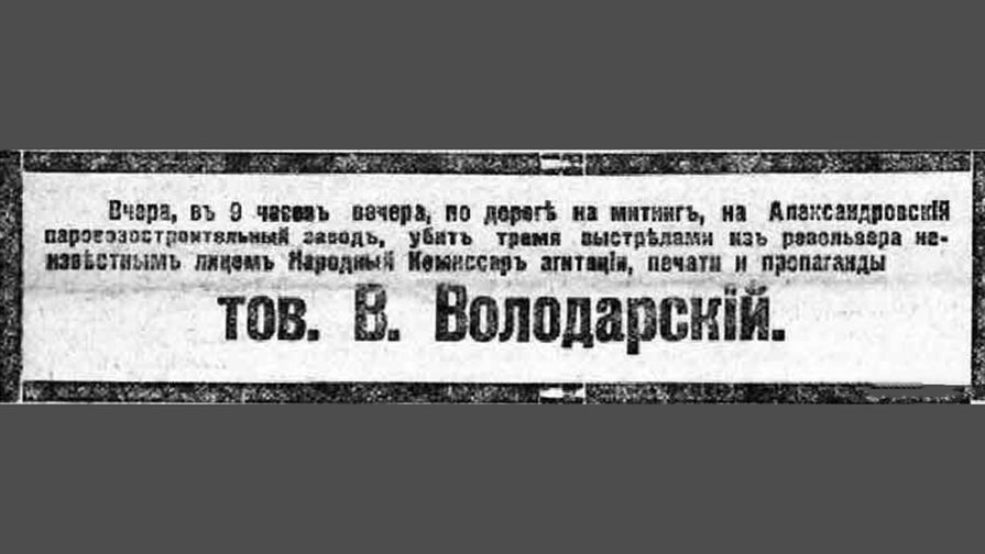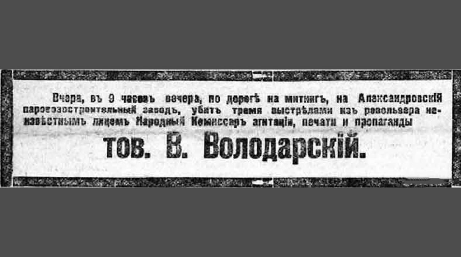 «Первой ласточкой», приведшей в итоге к красному террору, стало убийство народного комиссара по делам печати, пропаганды и агитации, основателя и главного редактора «Красной газеты» Володарского. Смерть настигла видного революционера 20 июня, когда он направлялся в машине на митинг на Обуховский завод в Петрограде. Расправа над соратником, который в свои 26 лет играл важную роль в структуре РКП (б), явилась шоком для Ленина и остальных товарищей. Убийство списали на эсеров, которые, впрочем, категорически отрицали свою причастность к случившемуся. В условиях тотальной неразберихи следствие по делу об убийстве не было доведено до логического завершения. Оно до сих пор таит в себе массу загадок. Не установлены досконально мотивы, побудившие рабочего Никиту Сергеева схватиться за пистолет. На «процессе эсеров» В 1922 году в организации убийства признался Григорий Семенов. Однако ходили слухи и о личной мести Сергеева…