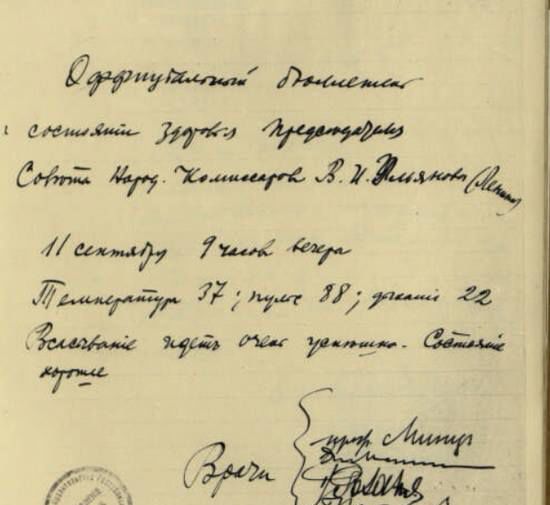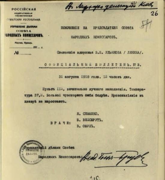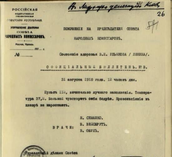 Опубликован бюллетень кремлевских врачей: «В наличии два огнестрельных ранения. Одна пуля вошла под левую лопатку, прошла через грудную полость и, задев верхнюю долю лёгкого, застряла в правой стороне шеи выше правой ключицы. Вторая пуля попала в левое плечо. Она раздробила кость и застряла в левой плечевой области, вызвав внутреннее кровоизлияние».