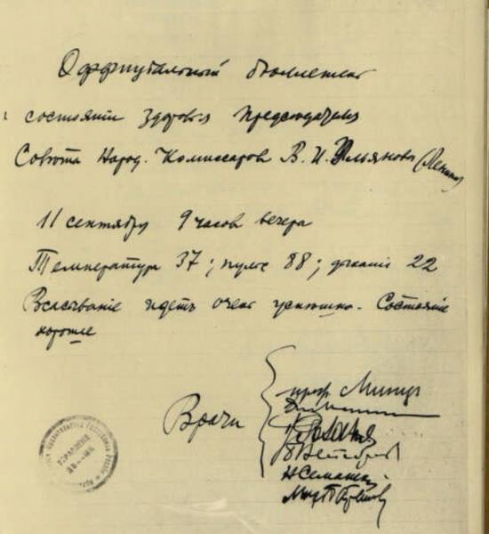 «Температура поднялась. Владимир Ильич находился в полузабытье, иногда произнося отдельные слова. Профессор Минц, уезжая, выразил свое крайнее изумление стойкости и терпению Владимира Ильича, который не проронил ни звука даже тогда, когда ему делали ужасно болезненную перевязку. О состоянии Владимира Ильича Минц не говорил ничего определенного, сказав лишь, что это ранение принадлежит, несомненно, к разряду весьма тяжелых».