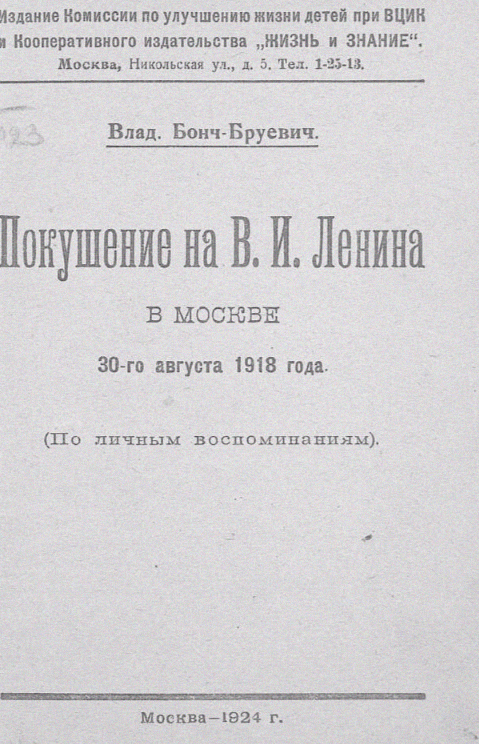 «1 (14) января 1918 года, под вечер, Владимир Ильич выступал в Михайловском манеже перед первым отрядом социалистической армии, уезжавшим на фронт. На митинг его сопровождали швейцарский товарищ Платтен и пишущая эти строки. Выйдя после митинга из манежа, мы сели в закрытый автомобиль и поехали в Смольный. Но не успели мы отъехать и нескольких десятков саженей, как сзади в кузов автомобиля, как горох, посыпались ружейные пули. «Стреляют», — сказала я. Это подтвердил и Платтен, который первым долгом схватил голову Владимира Ильича (они сидели сзади) и отвел ее в сторону, но Ильич принялся уверять нас, что мы ошибаемся и что он не думает, чтобы это была стрельба. После выстрелов шофер ускорил ход, потом, завернув за угол, остановился и, открыв двери автомобиля, спросил: «Все живы?» — «Разве в самом деле стреляли?» — спросил его Ильич.
