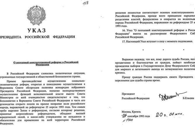Ельцин объявляет телезрителям о принятом Указе «О поэтапной конституционной реформе в Российской Федерации». Президент прекращает деятельность Съезда народных депутатов и Верховного Совета и назначает выборы Федерального Собрания на 12 декабря. Таким образом, появляются новые органы законодательной власти — Совет Федерации и Государственная Дума. Ельцин переподчиняет Центробанк правительству, приостанавливает действие конституции РСФСР и работу Конституционного суда. Генеральный прокурор переподчинен президенту.