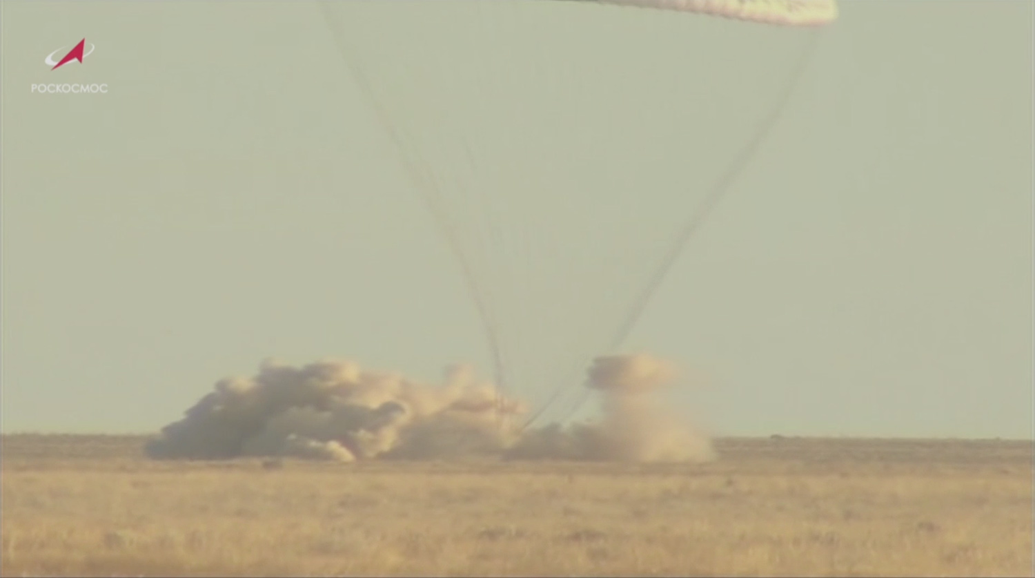 Начался активный спуск в атмосфере. Олег Артемьев доложил, что спуск происходит по номинальной траектории, перегрузка достигла перегрузки в 3,56 G.