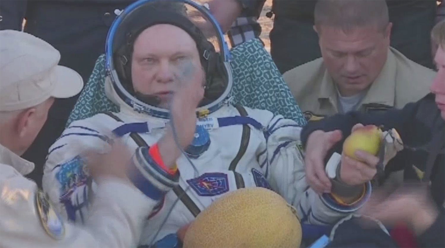 «Роскосмос»Олега Артемьева посадили в кресло, и сразу передали подарки от жены. Среди них --дыня и очищенная морковка!