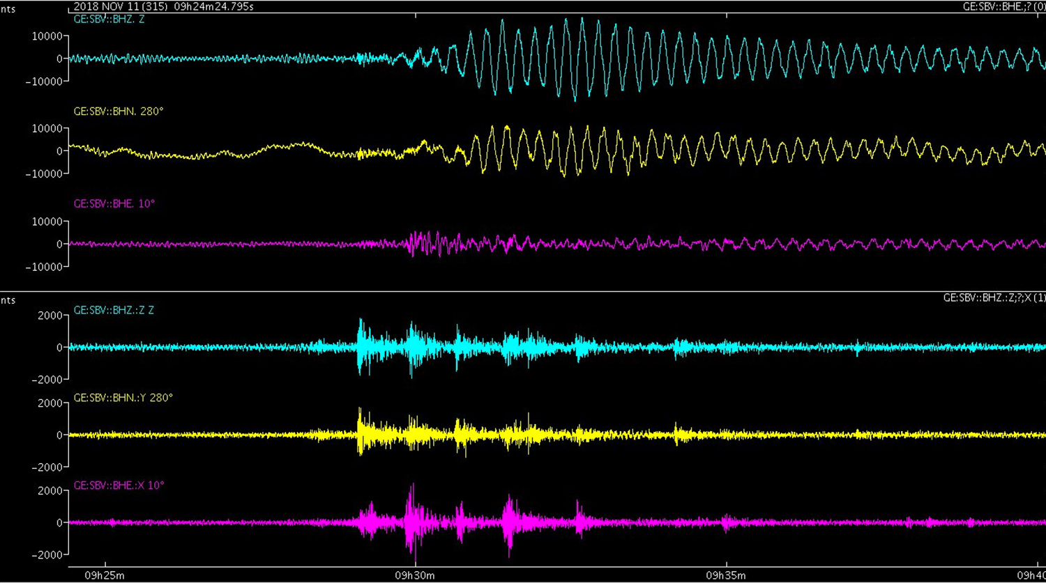 Самые быстрые — P-волны (первичные волны), которые распространяются группами. Следом идут поперечные S-волны (вторичные волны), чья скорость обычно в два раза ниже первичных волн. Оба типа относятся к объемным волнам и имеют относительно высокие частоты. Наконец, возникают поверхностные волны, которые имеют большой период — именно такие и были зарегистрированы 11 ноября. Во время сильных землетрясений эти волны могут огибать земной шар по несколько раз, заставляя Землю «звенеть» подобно колоколу, поясняет Хикс.