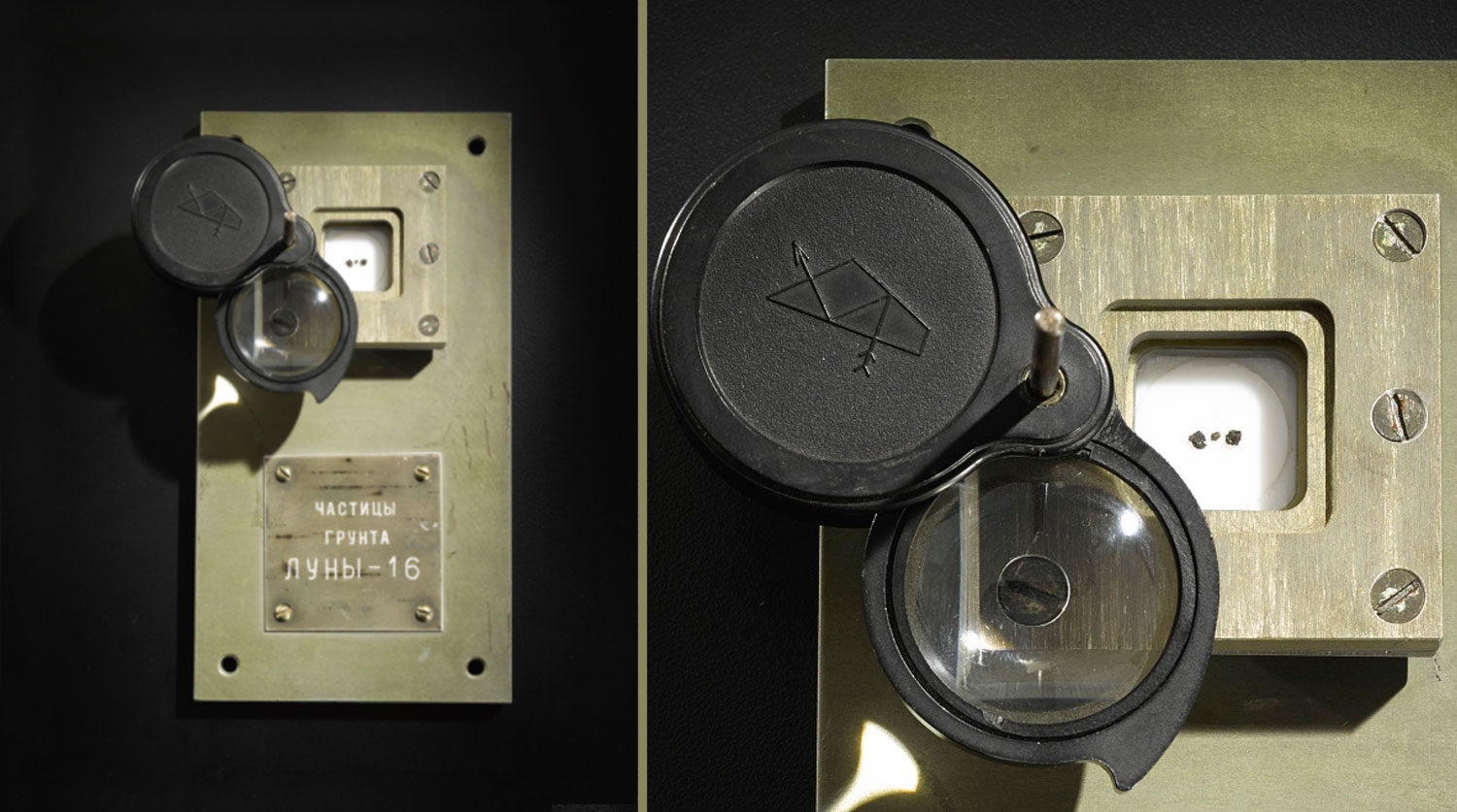 Фрагменты лунного грунта размером от 1 до 2 мм в диаметре находятся в металлическом футляре с увеличительным стеклом сверху и табличкой на русском языке «Частицы грунта «Луны-16».