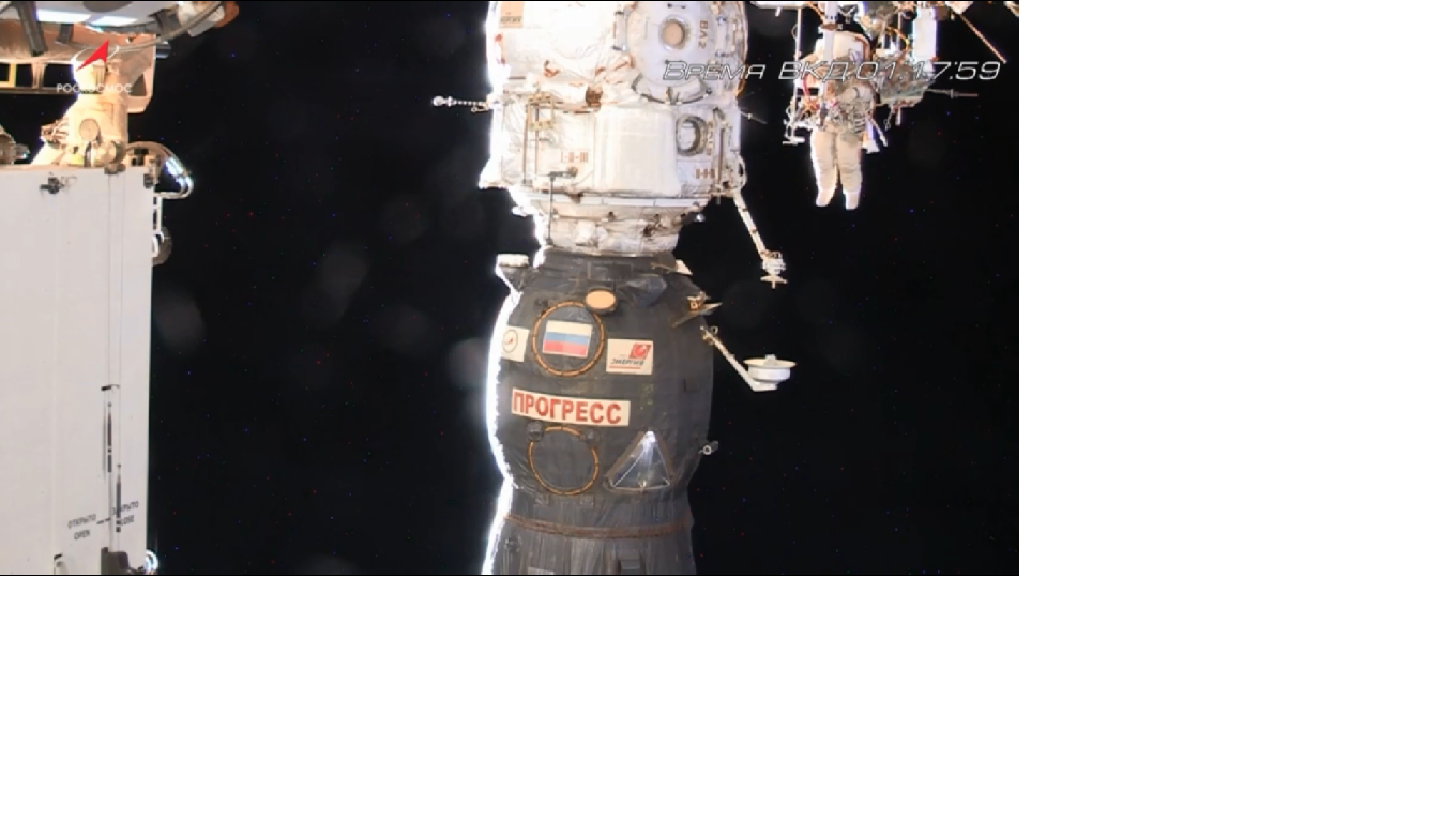 Сергей Прокопенко передвигается к шлюзовому люку стыковочного отсека и идет за Олегом Кононенко до стрелы. Картинка видна с его камеры. Князев поясняет, что в момент передвижения у космонавта должно быть всегда две точки фиксации – рука или карабин.